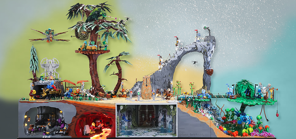 Michael and I designed a sci-fi landscape with floating rock spires, glowing green waterways, and abysmal foliage, hinting at a story and larger world beyond the build. We considered including ourselves in the build, but Brobot became a central character symbolizing our shared experiences on the show. We chose “Odyssey” to suggest this is just one chapter in a larger journey, reflecting the unknown adventures that lie ahead in our own lives.