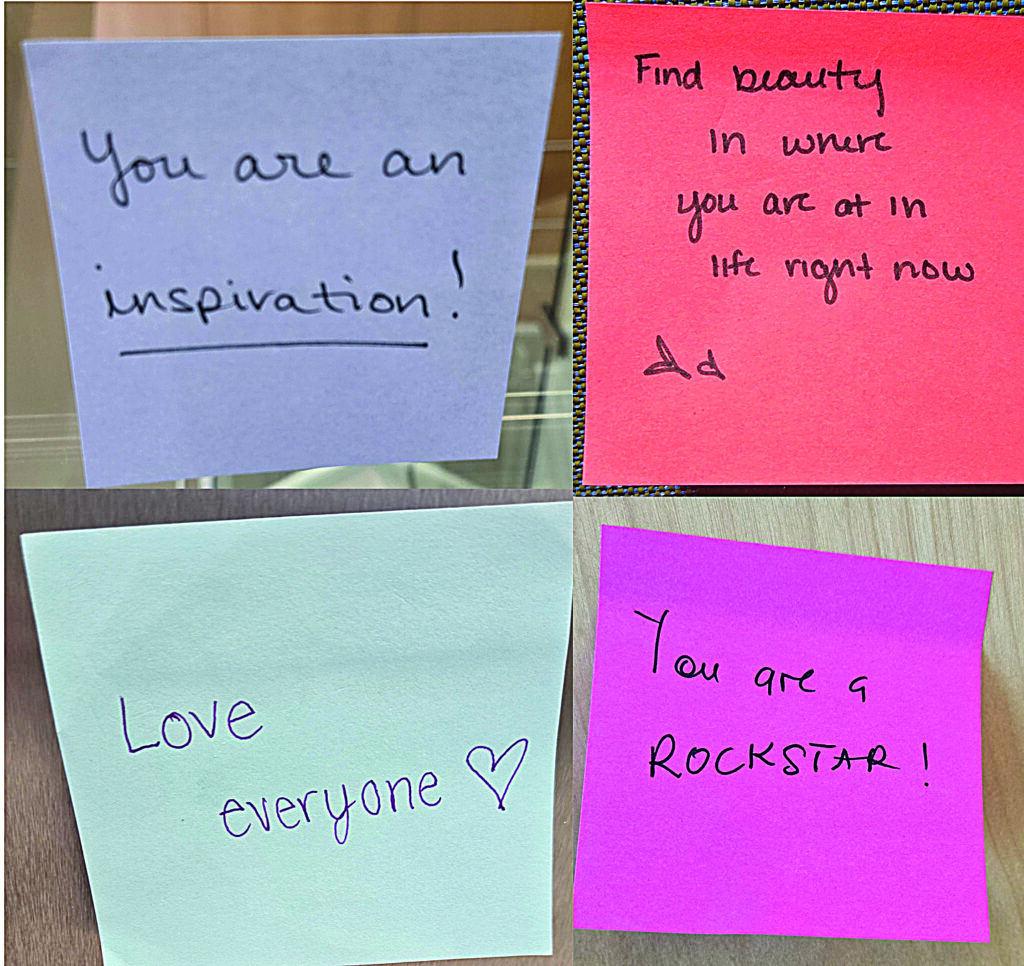 Gwen said, of her part in this effort, “I really enjoyed this because it made me feel more connected with the rest of the college, and not just the department I am part of. I hope the people who read the sticky notes smile and realize that they belong here. College is hard and can be stressful, but everyone around them believes in their abilities and will empower them to succeed.”