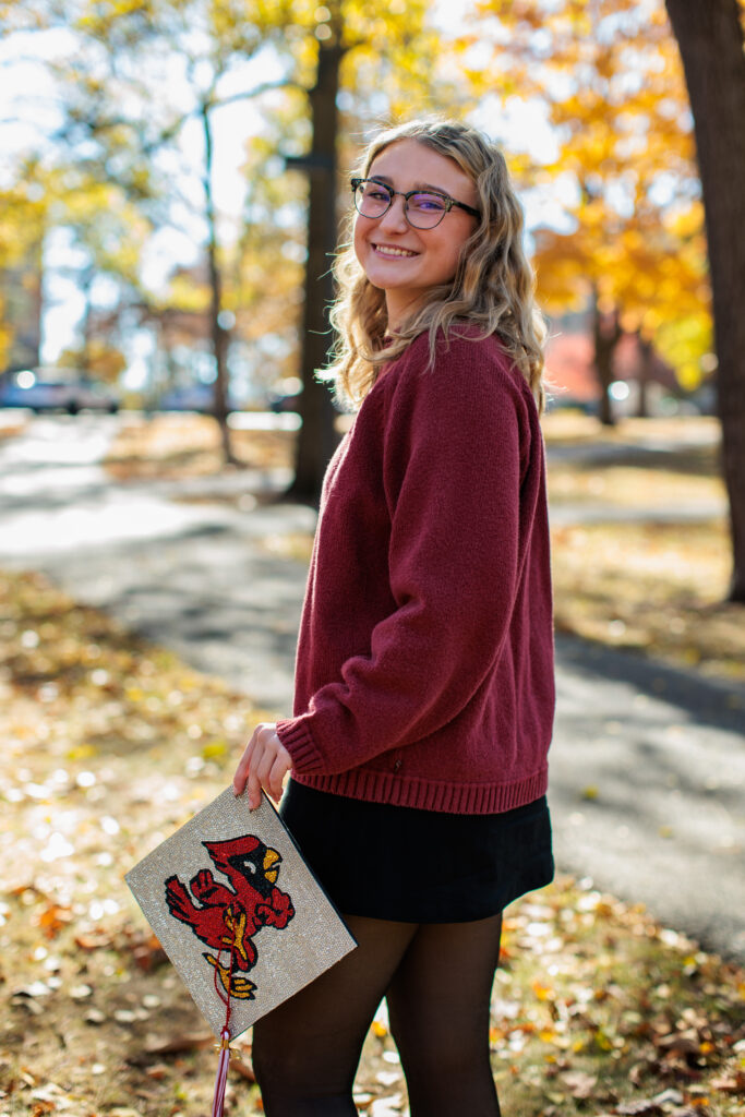When McKenna Bivens walks across the graduation stage this December, her cap will shimmer in the light — a sparkling, hand-crafted, bedazzled dancing Charlie Cardinal. The project took more than 24 hours, and for McKenna, it’s more than just decoration. “All the time and energy I put into it reflects how much I’ve cared about my experience here,” she said. “It feels comforting and fun, just like Ball State has been.”