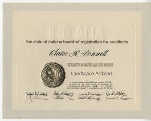 April Westcott donated an addition to the Claire Bennett Associates collection. This included certificates, recognitions, and awards from the design career of Claire Bennett. Bennett was one of the first women in the United States to open her own landscape architectural practice.