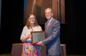 Dr. Lisa Ruble receives the 2025 Outstanding Research Award from Ball State President Geoffrey Mearns